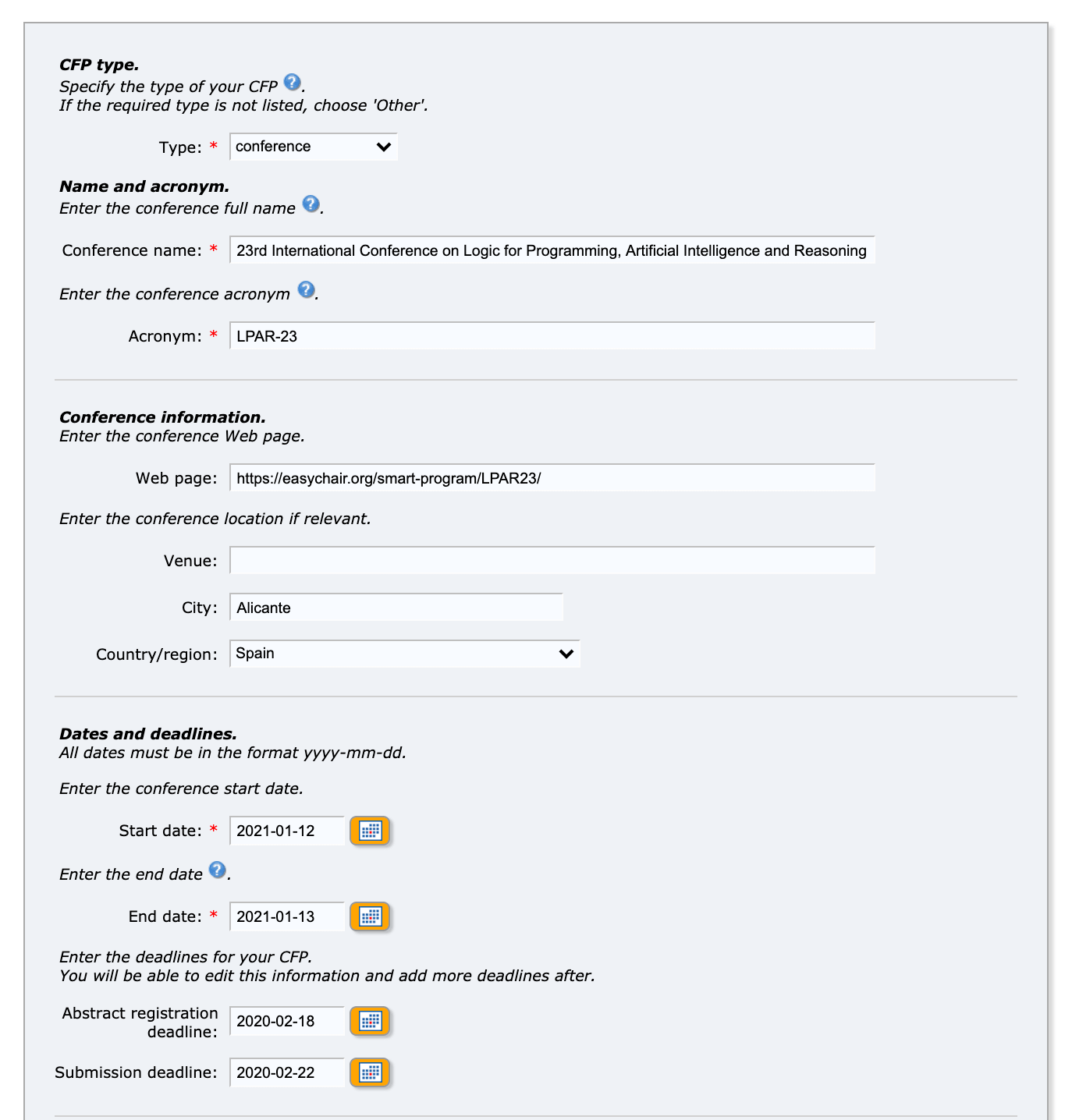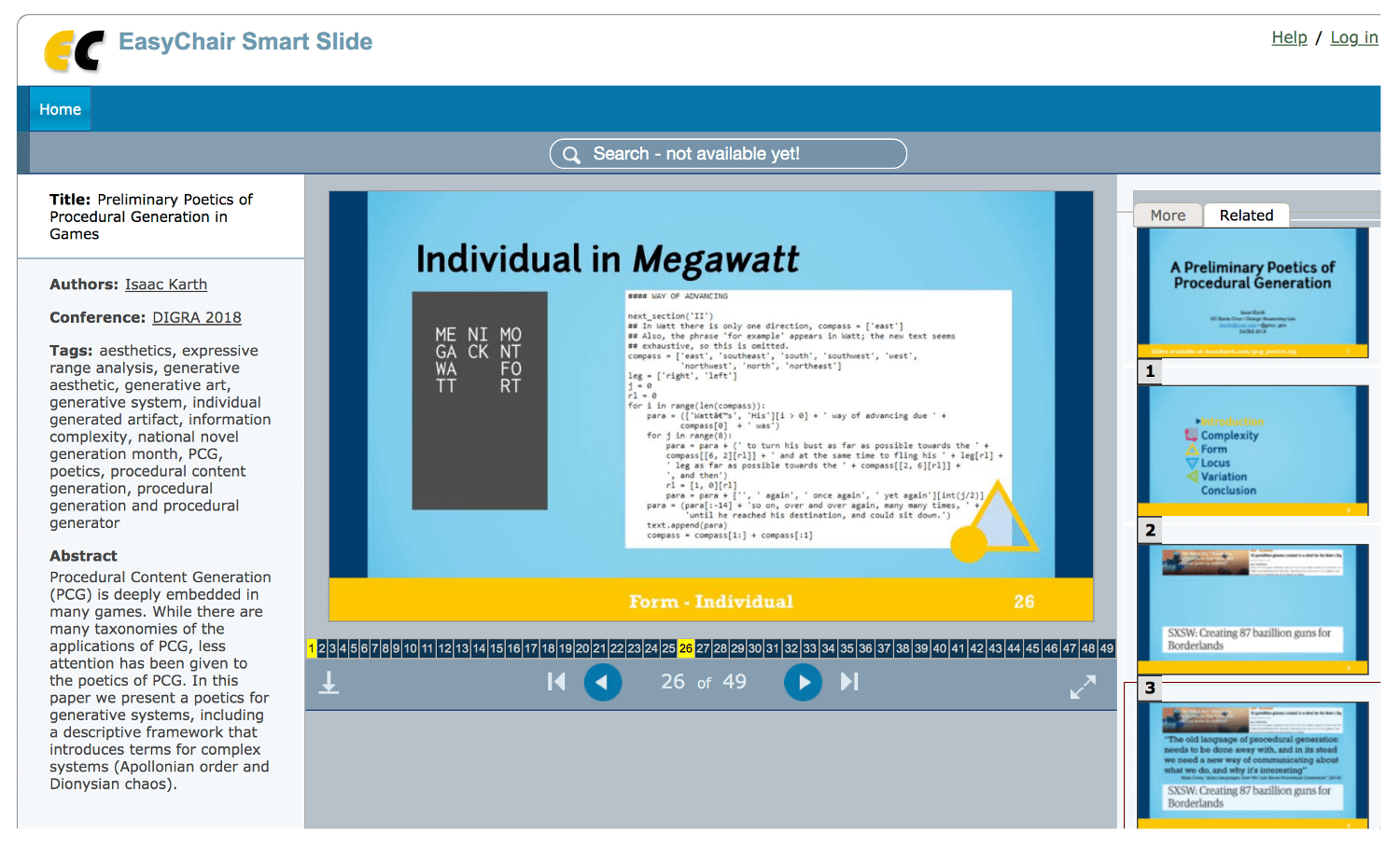 As an example, take a look at the Smart Program pages of VSL 2014, a mega-conference consisting of more than 10 conferences and nearly 100 workshops. Start browsing it from a day program, and then follow the links. On June 5, 2014, this program comprised of 2196 Web pages. Most of them were created automatically by EasyChair using data provided by the authors, program committees and program managers. In many cases this data was taken from submissions already available in EasyChair, so very little work, or no work at all, was required to use this data in the online program.